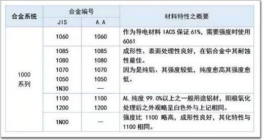 一系的鋁成形性、表面處理性好,在鋁合金中其耐蝕性佳。其強度較低,純度愈高其強度愈低。