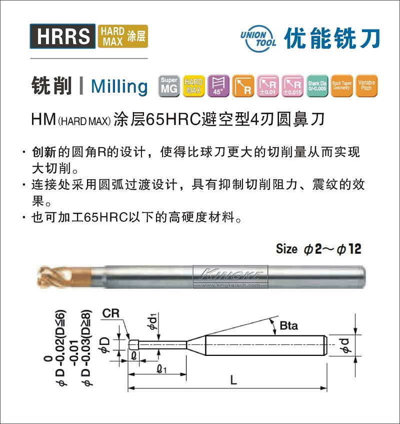 HRRS-S HM涂層HRC65避空型4刃短柄圓鼻刀